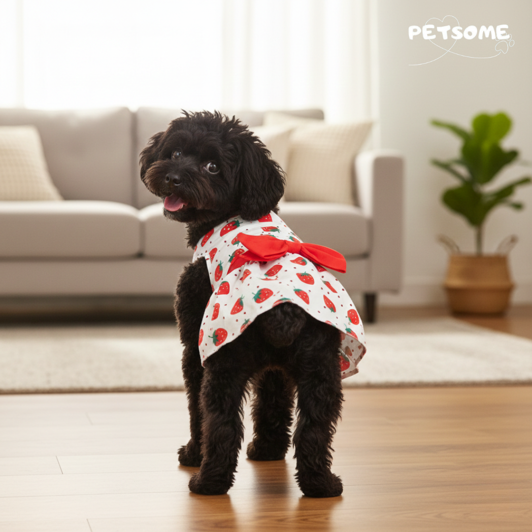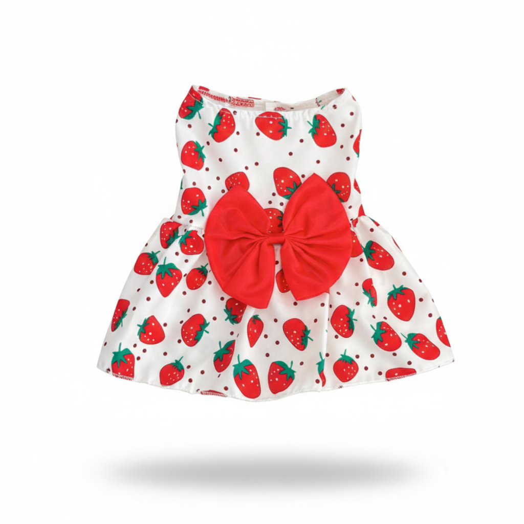 Make your furry friend the star of the season with this adorable strawberry-print dress from Petsome. Featuring a playful red berry and polka dot pattern on a crisp white background, this dress is highlighted by a bold red statement bow at the back. It’s a sweet, comfortable choice for indoor lounging or showing off during a sunny day at home.