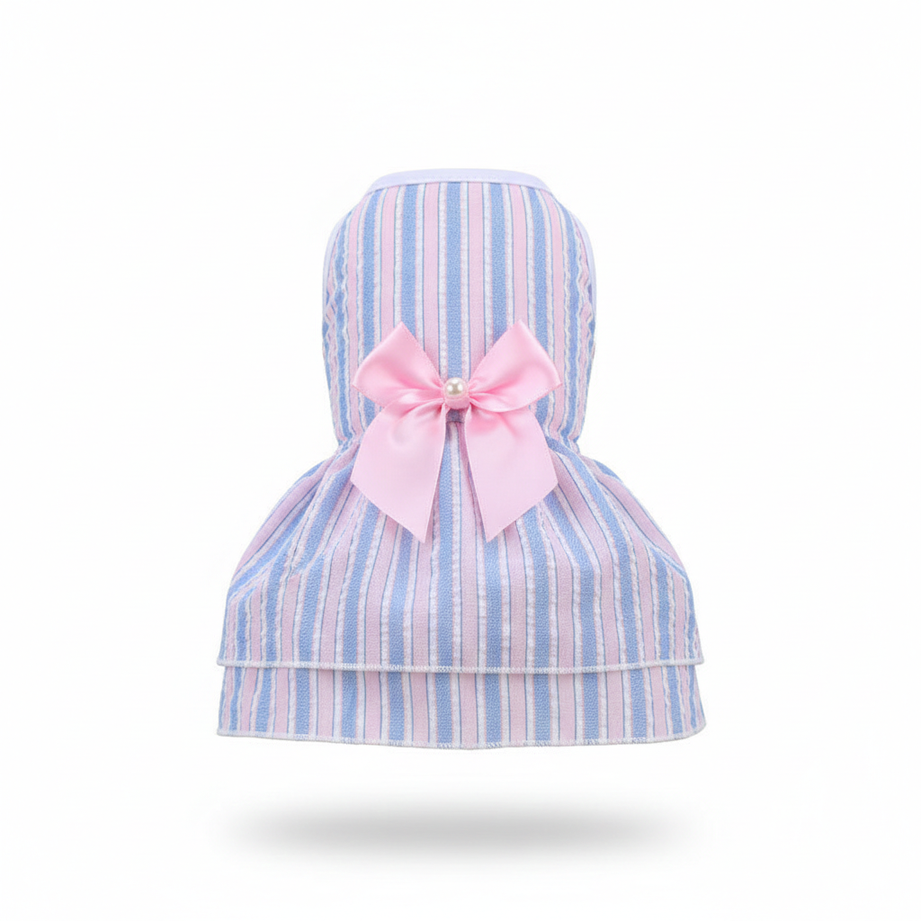 This sweet, pastel-themed dress from Petsome is designed for your furry friend, featuring soft vertical stripes in sky blue and blush pink. This lightweight, breathable piece is finished with a tiered skirt and a satin pink bow with a delicate pearl accent, perfect for spring strolls and special occasions.